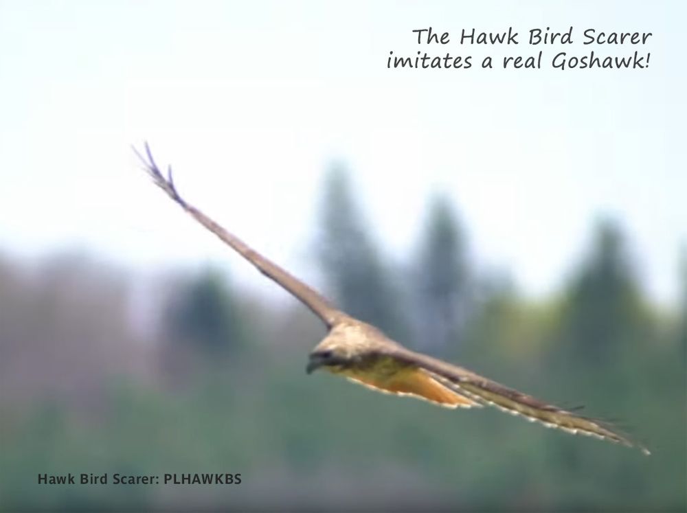 The Hawk Bird Scarer is a plastic replica of a real attacking Goshawk. Before a Goshawk attacks its prey (typically other birds) it hovers over its prey before diving head first. To successfully use a Hawk Bird Scarer simply locate it above the area to be protected so that it looks like a real attacking Goshawk. The kit comes ready to assemble with instructions included (or watch the video here).