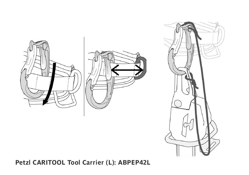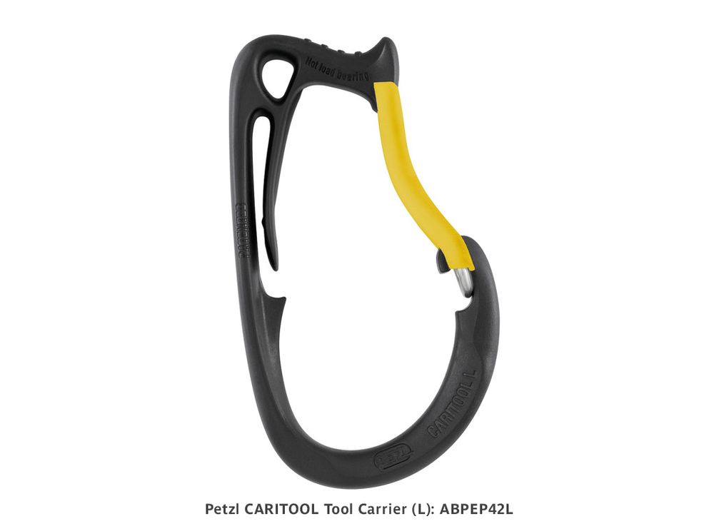 The CARITOOL tool holder allows the user to select and return tools with just one hand. It slips in through the harness straps and stays in place, thanks to its stabilizing clip. The gate has a protective feature that limits accidental snagging. It is available in small and large sizes.
