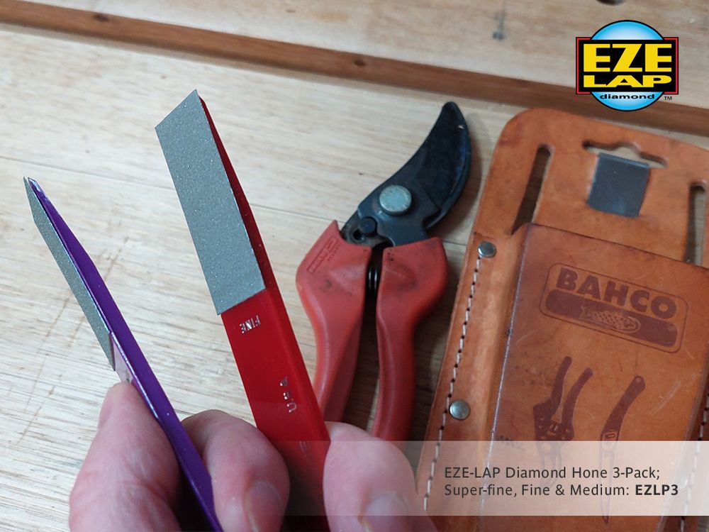 Set of three EZE-LAP diamond hone sharpeners. These popular and versatile sharpeners produce a razor sharp edge quickly and easily. Its convenient size enables effective sharpening of secateurs, loppers, hedge shears and snips without dismantling.