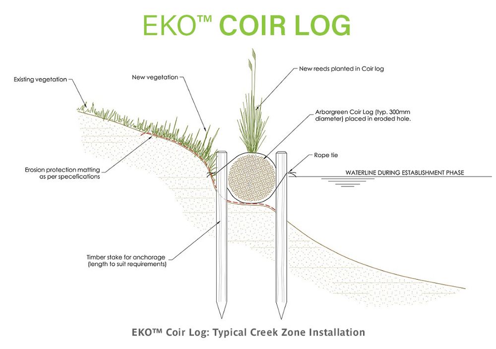 Arborgreen's biodegradable EKO™ Coir Logs are used in a wide range of applications. Originally used for the protection of stream banks, coir logs (coconut fibre logs) are a 99% biodegradable product and are now being used to arrest scouring and soil loss on slopes and in gullies.