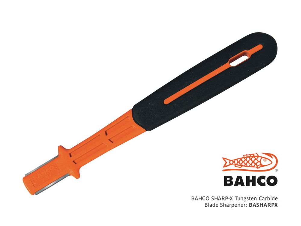 BAHCO's SHARP-X professional tungsten carbide sharpener with rubberised handle for secure grip, plus finger stop lugs for safety.
