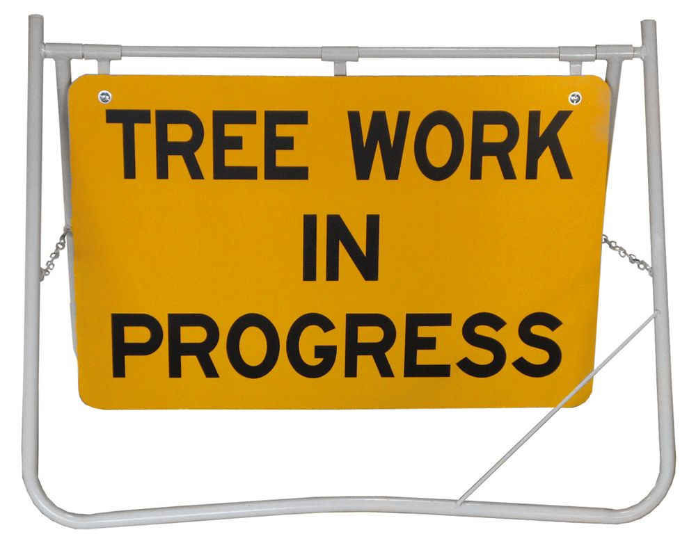 Tree Work In Progress swing stand safety sign. This safety sign is reflective (Class One) complying with RTA Standards and Australian Standards 1742 3-2002. 900mm long x 600mm high. The sign swings from a galvanised, tubular steel frame.