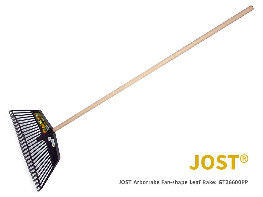 Quality European Made Leaf Rake by JOST Arborrake. Large 600mm wide head with long tough flexible tines. This large leaf rake is a great for leaves and grass clippings. Once you rake all your debris into a pile the long angled tines are ideally angled so that you can turn over the rake and scoop up the pile! There is no need to bend. A very tough but lightweight rake that never breaks.