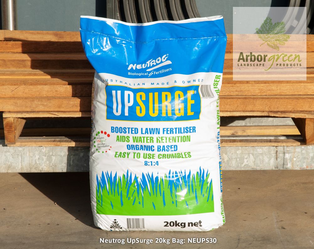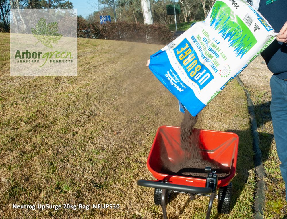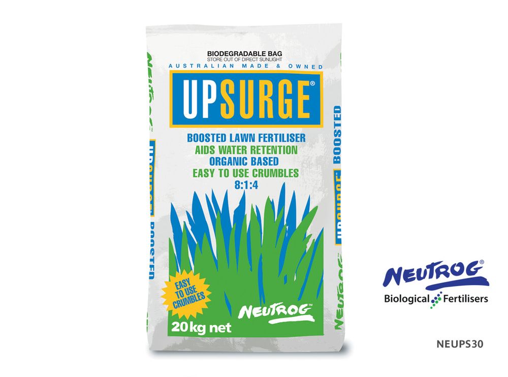 UPSURGE Boosted lawn fertiliser by Neutrog. Highly concentrated, Organic based and safe to handle. Clean, easy to use crumbles. Australian Made & Owned.