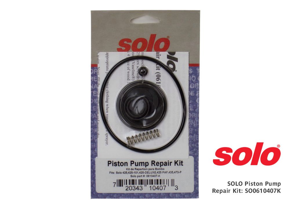 Keep your SOLO sprayer working like new with genuine replacement parts. Fits all SOLO backpack piston pump sprayers: 425, 425-101, 425-DELUXE, 435, and 473-P. Includes a Viton® collar, valve plates, O-rings, a spring and a seal plug for the pressure regulating valve on select models.