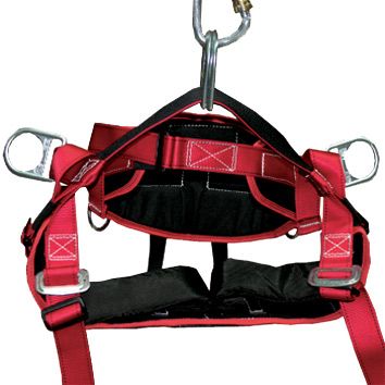 A classic harness design from the USA with a hard seat, sliding Dees, one pair of large side Dees and multiple attachment points including a central chainsaw attachment point on the back.