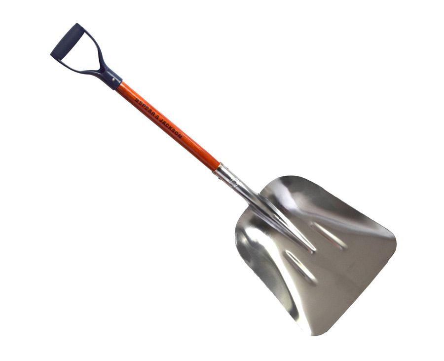 Large D-handled aluminium mulch, woodchip & grain scoop by Spear & Jackson. Features a timber shaft with plastic D-handle, reinforcing steel collar and 2 year warranty.