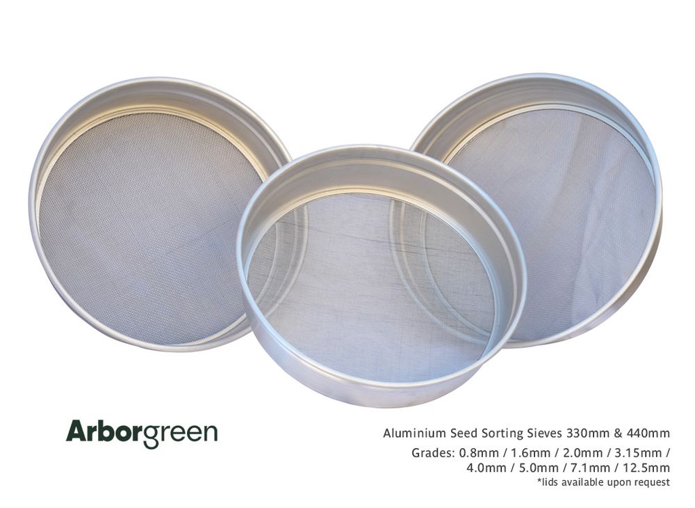 Available seed sorting sieve grades: 0.8mm, 1.6mm, 2.0mm, 3.15mm, 4mm, 5mm, 7.1mm & 12.5mm. Sold individually.