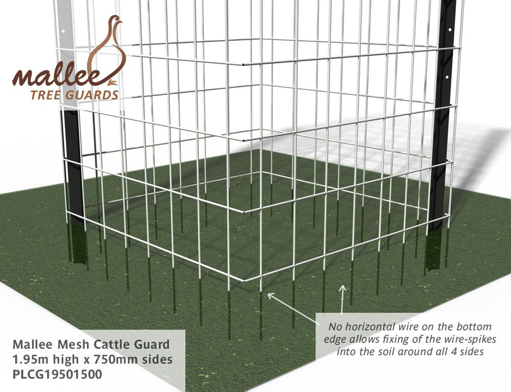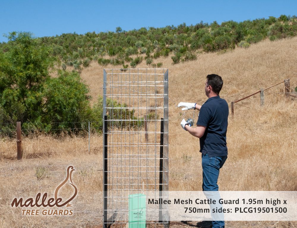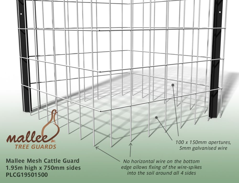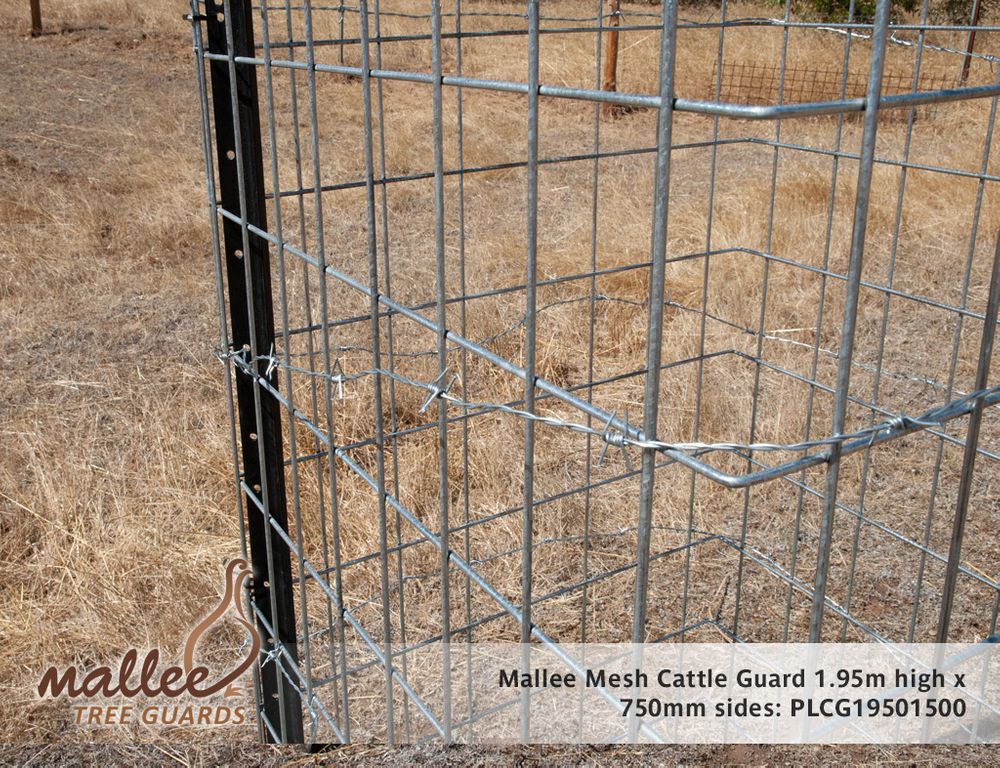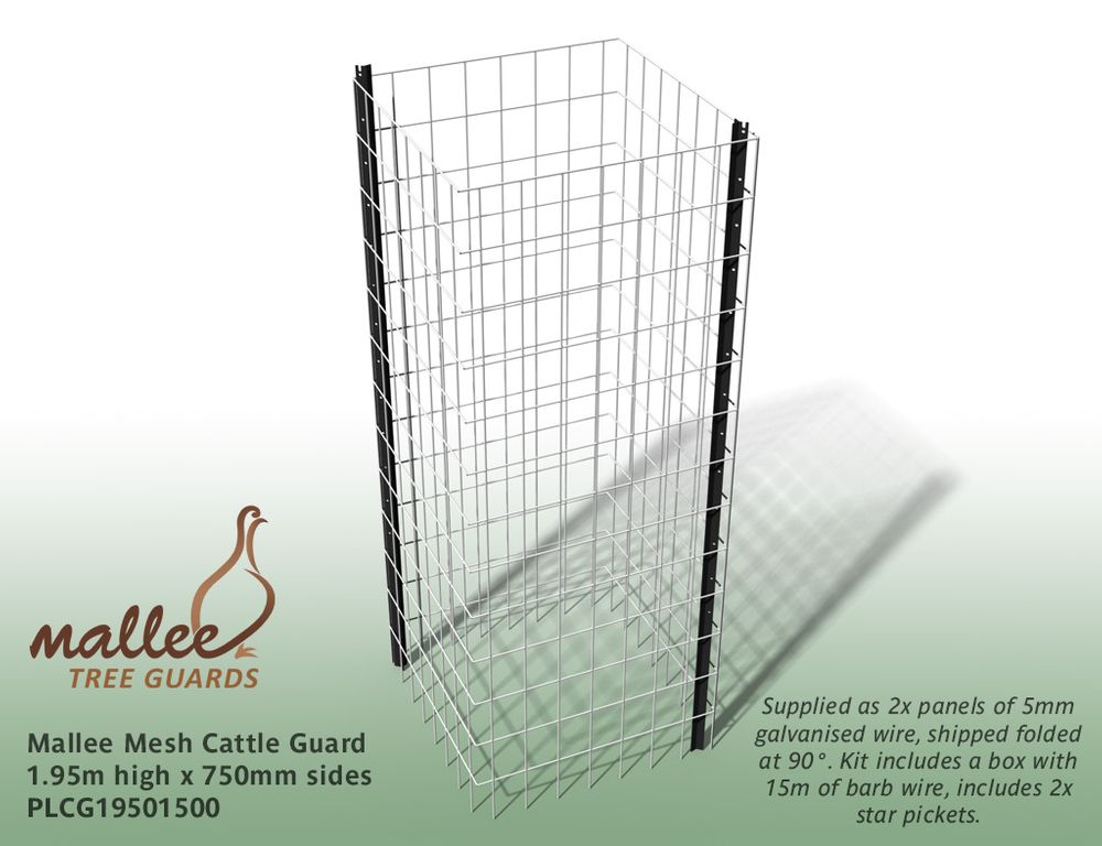Mallee Mesh Cattle Guard forms a sturdy guard 1.95m high with 750mm sides and comes complete with star pickets and 15m of barb wire as an added deterrent. They will also offer protection against deer and other large browsing animals. For a cost effective guard against sheep; see our Mallee Mesh Sheep Guard - call 1300 760 642.