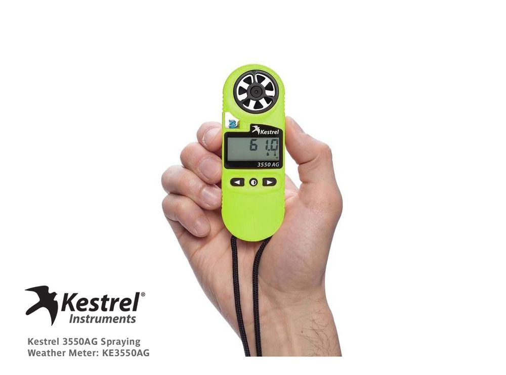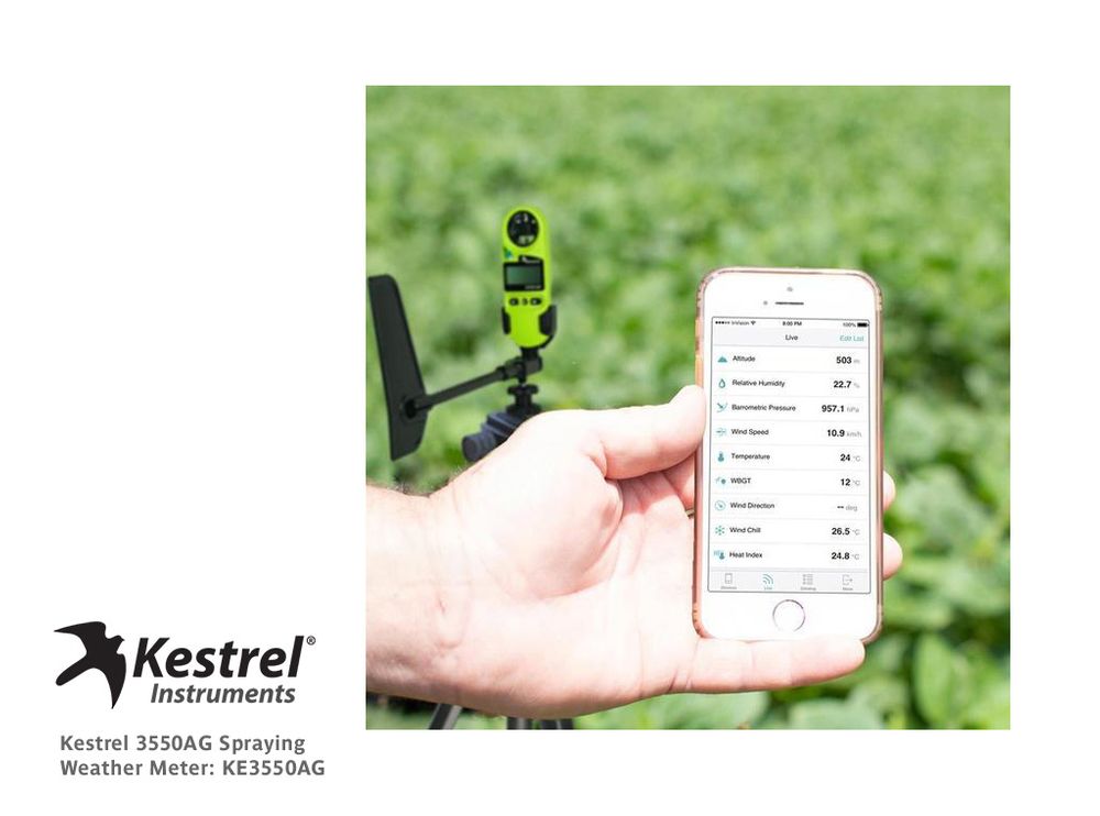 The 3550AG is an agriculture specific version of the powerful Kestrel 3000 series, measuring temperature, wind speeds, barometric phenomena and pressure trends. Off-target herbicide or pesticide drift can not only cause damage to nearby vulnerable crops but also pose a serious threat to people, livestock, wildlife, and the surrounding community.