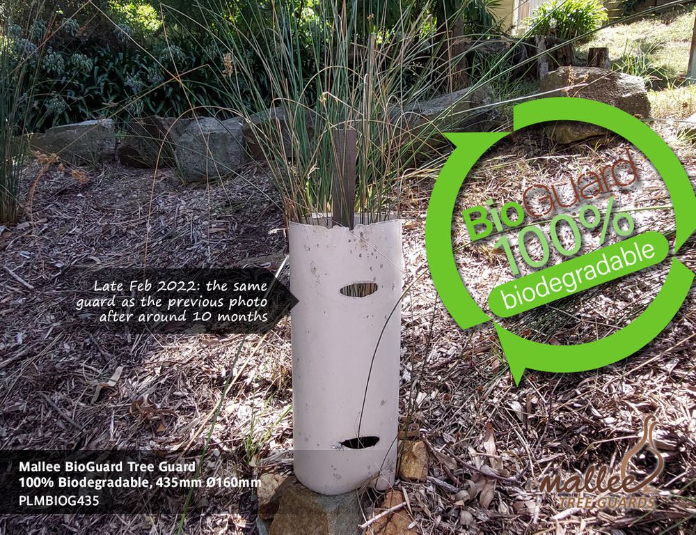 They will naturally biodegrade in home compost into CO2, water and biomass within approximately 24 weeks. Note: the guard may break down quickly in very high rainfall events and exposed sites with adverse weather conditions.