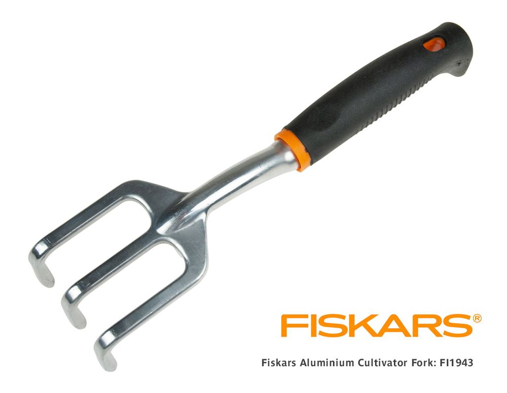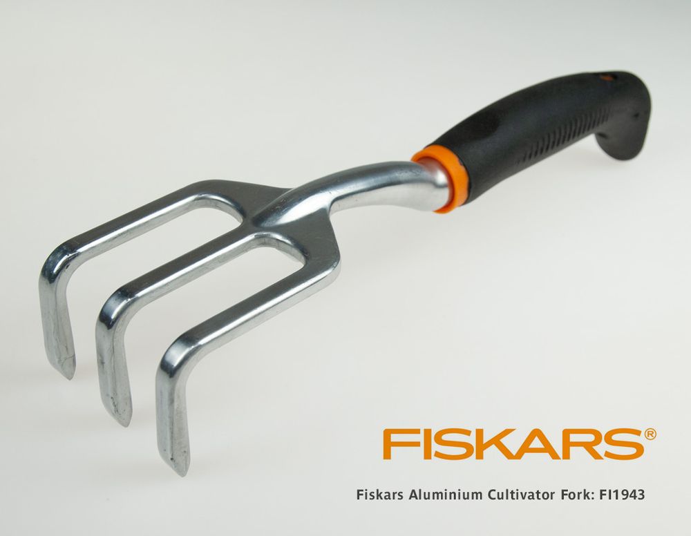 Fiskars small aluminium garden cultivator fork. Solid cast one-piece aluminium construction with a comfortable soft grip handle.