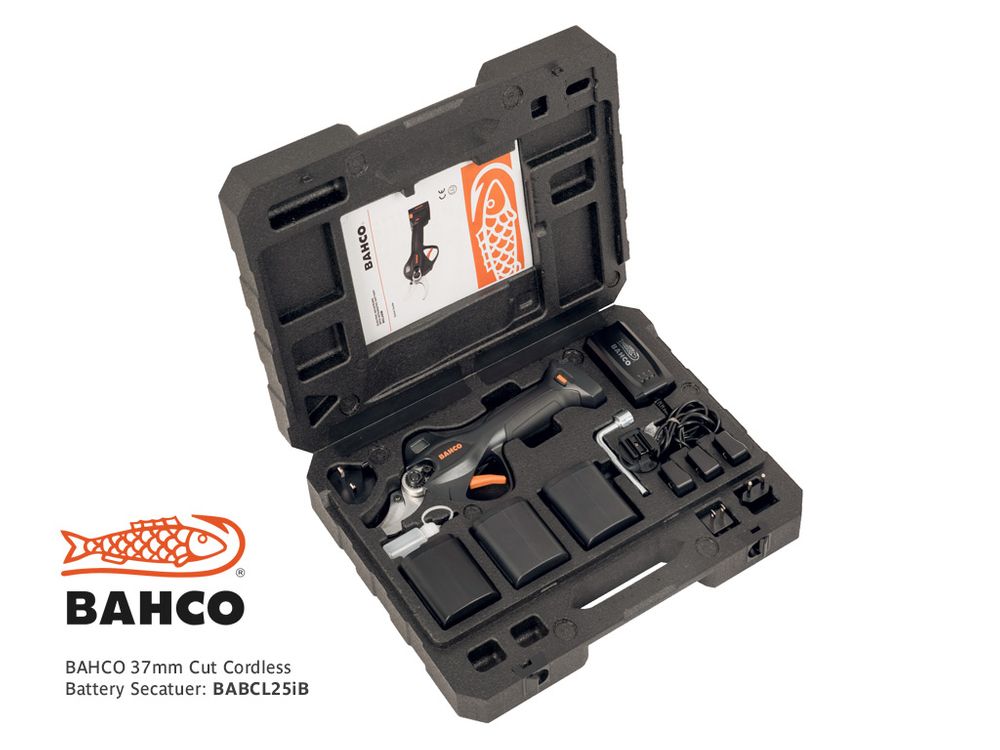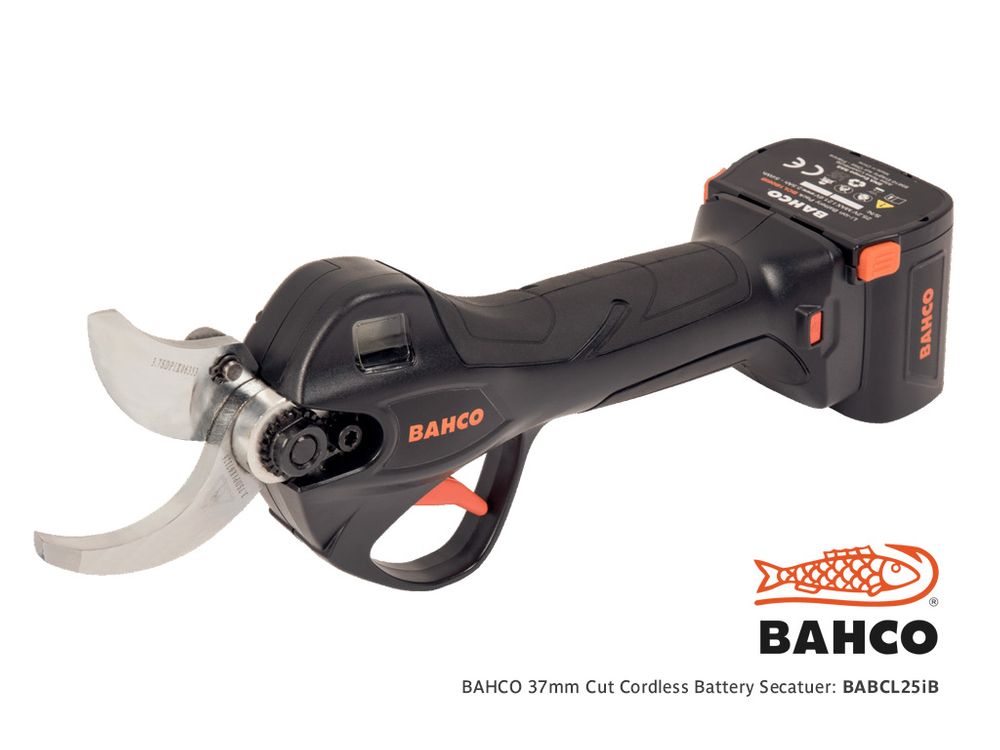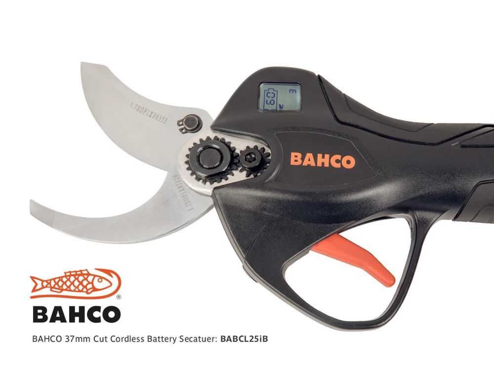 The BAHCO BCL25iB cordless Li-ion secateur comes complete with 3 batteries for up to 8 hours runtime. Featuring hard chromed high quality steel blades the unit offers a progressive cut with 2 blade opening settings and on-board LED screen indicating remaining charge & number of cuts.
