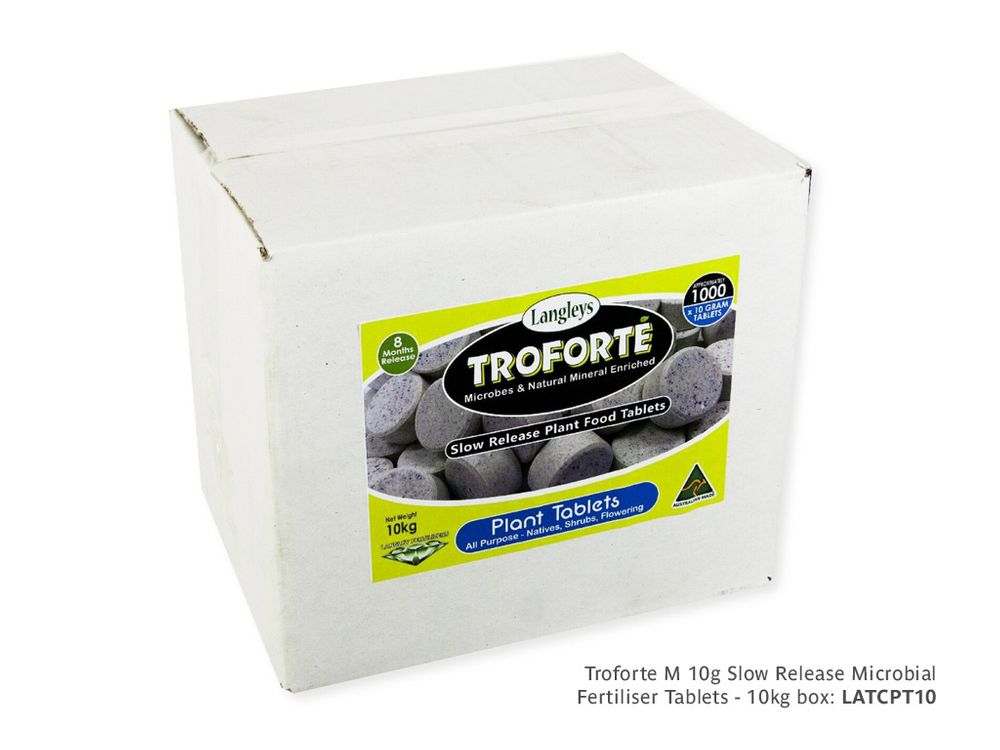Troforte® plant tablets contain a biologically coated specifically engineered mineral base incorporating up to 60 minerals and scientifically balanced blend of up to 24 strains of well researched and trialled Australian cultured beneficial soil microbes. These include bacteria, fungi and algae to carry out wide range of biological activities within the soil such as Nitrogen fixing, Nutrients building, producing growth hormones, decomposing organic matter to organic carbon, protecting beneficial bacteria by releasing antibiotics that can assist in inhibiting disease producing microbes like root rot, fungi and pythium as well as conditioning of soils by improving soil structure.