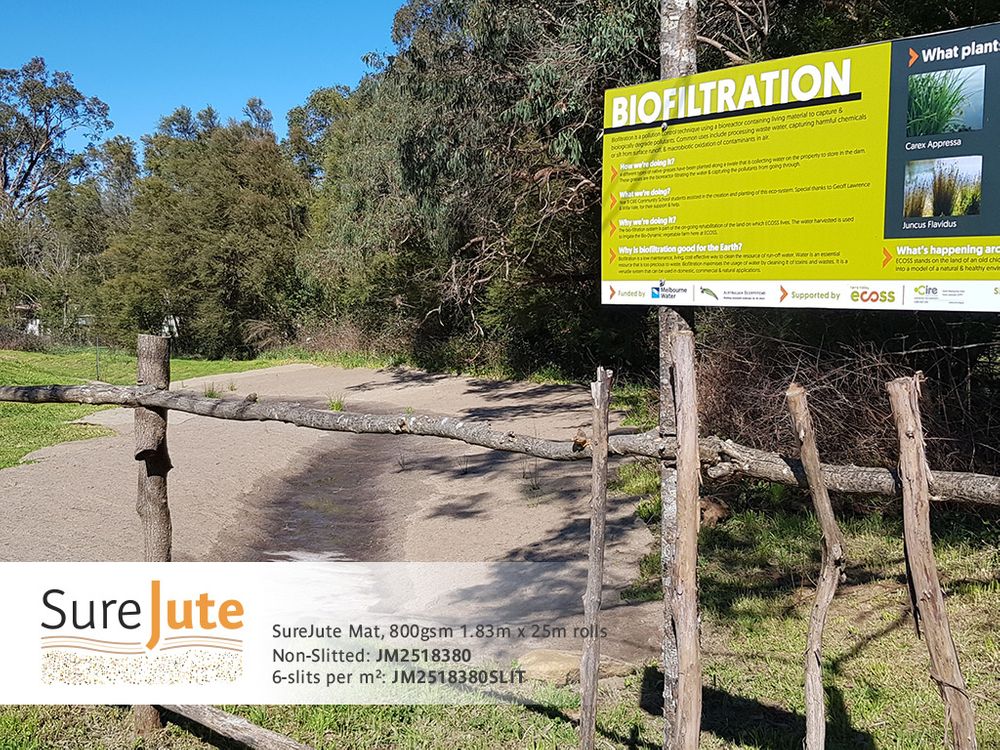 Jute Mat is an effective means of establishing vegetation quickly, suppressing weed growth, stabilising slopes & creek banks. It is often used for rehabilitation of environments such as creeks, wetlands and flood mitigation zones. Modified environments may include new land divisions, community bushcare & coastcare projects, mining and industrial landscape rehabilitation.